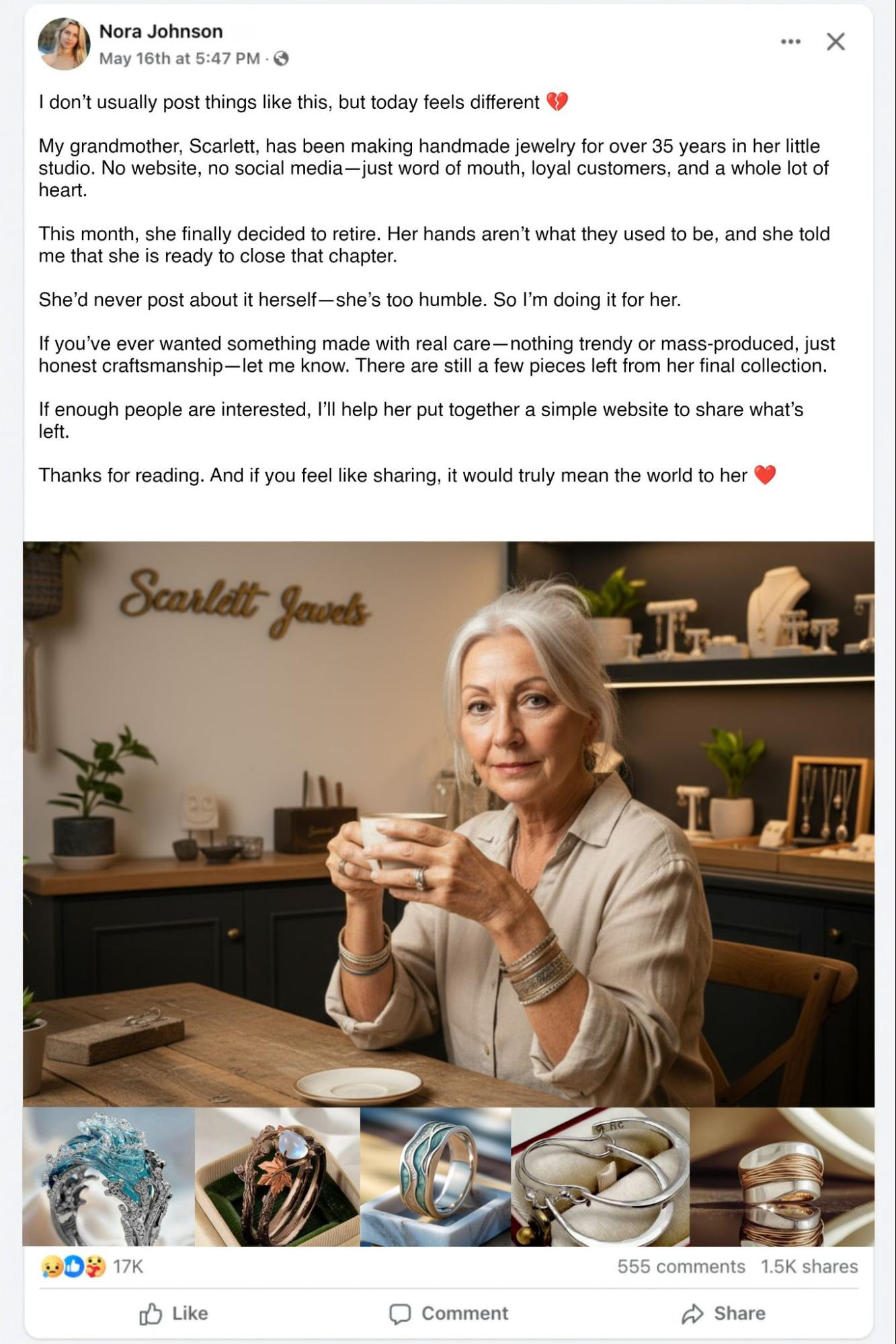 Last month, Scarlett’s granddaughter, Nora, shared a heartfelt post on Facebook. In it, she revealed that her grandmother—whose hands had spent decades shaping silver and stone—was finally ready to retire. Age and arthritis had made the intricate work too painful. Nora wanted the world to know the kind of woman Scarlett was: someone who stitched meaning into every necklace, who polished care into every clasp, who believed beauty should last longer than trends.