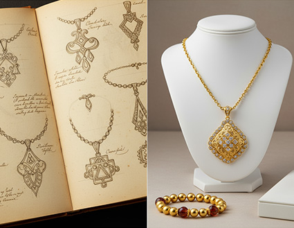 A split-screen image showing jewelry sketches on the left and the finished gold necklace with a matching bracelet on the right. (Photo: Echoes of Art)