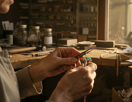 Scarlett’s hands, steady and deliberate, shaping a necklace from silver and turquoise. (Photo: The Timeless Chronicle)